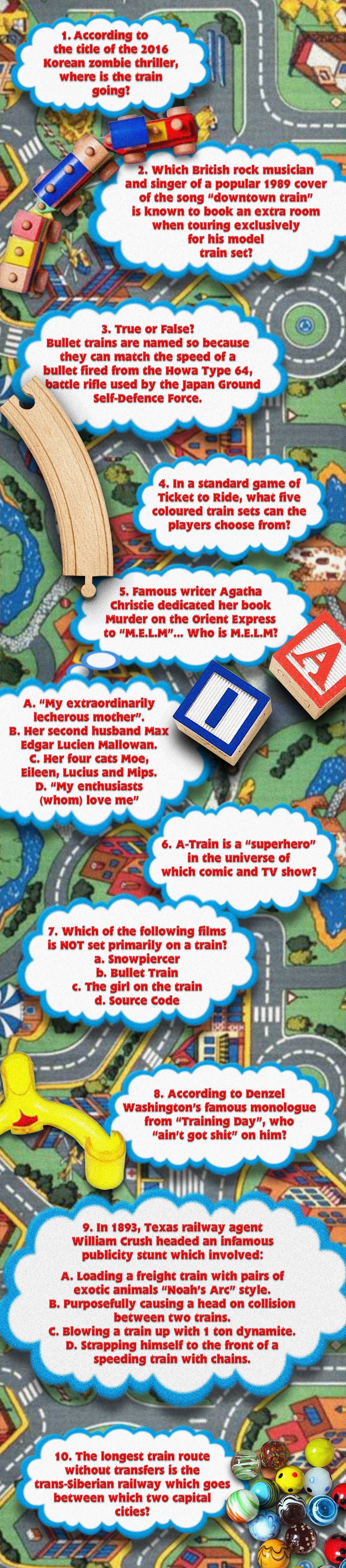 CHOO CHOO all aboard the train to Know Shit! Issue Eight! In honour of the train issue, I’ve been training relentlessly in the art of kung foo and jiu jitsu. I am now considered a master beige belt (the secret belt after black). Unfortunately this is a literary medium so you’ll just have to take my word for it. HYAH! SMACK! CRUNCH! POP! And now for my legendary final move, no one has seen this before and lived to tell the tale. HUAAAHH YA! Ok now that you’ve been well and truly thrilled by my demonstration of combat mastery, sit back and enjoy the quiz.